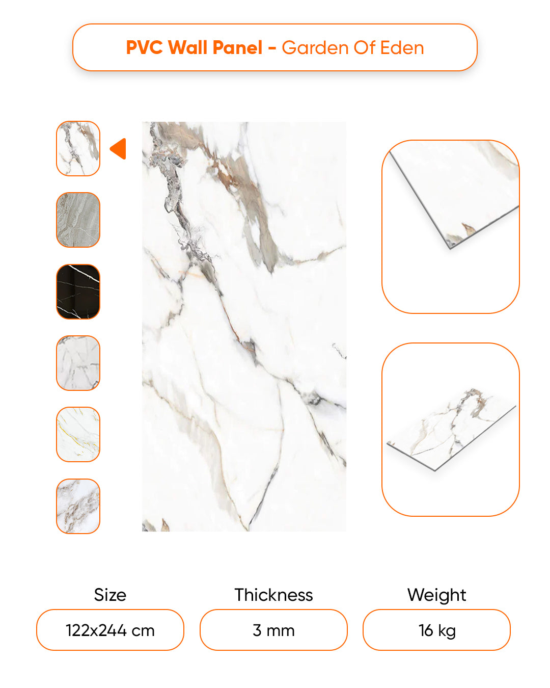 The Garden Of Eden wall panel brings luxurious natural marble design with warm beige and grey veins on a bright white base. Perfect for anyone who wants stylish walls with a Mediterranean flair – whether in the bathroom, kitchen, or living area.